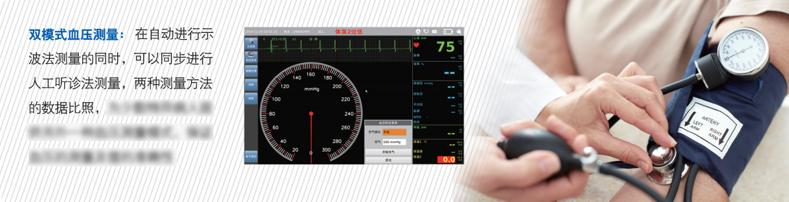 在自動進行示波法測量的同時,可以同步進行人工聽診法測量,兩種測量方法的數據比照,為少數特異病人提供另外一種血壓測量模式,保證血壓的測量及值的準確性。